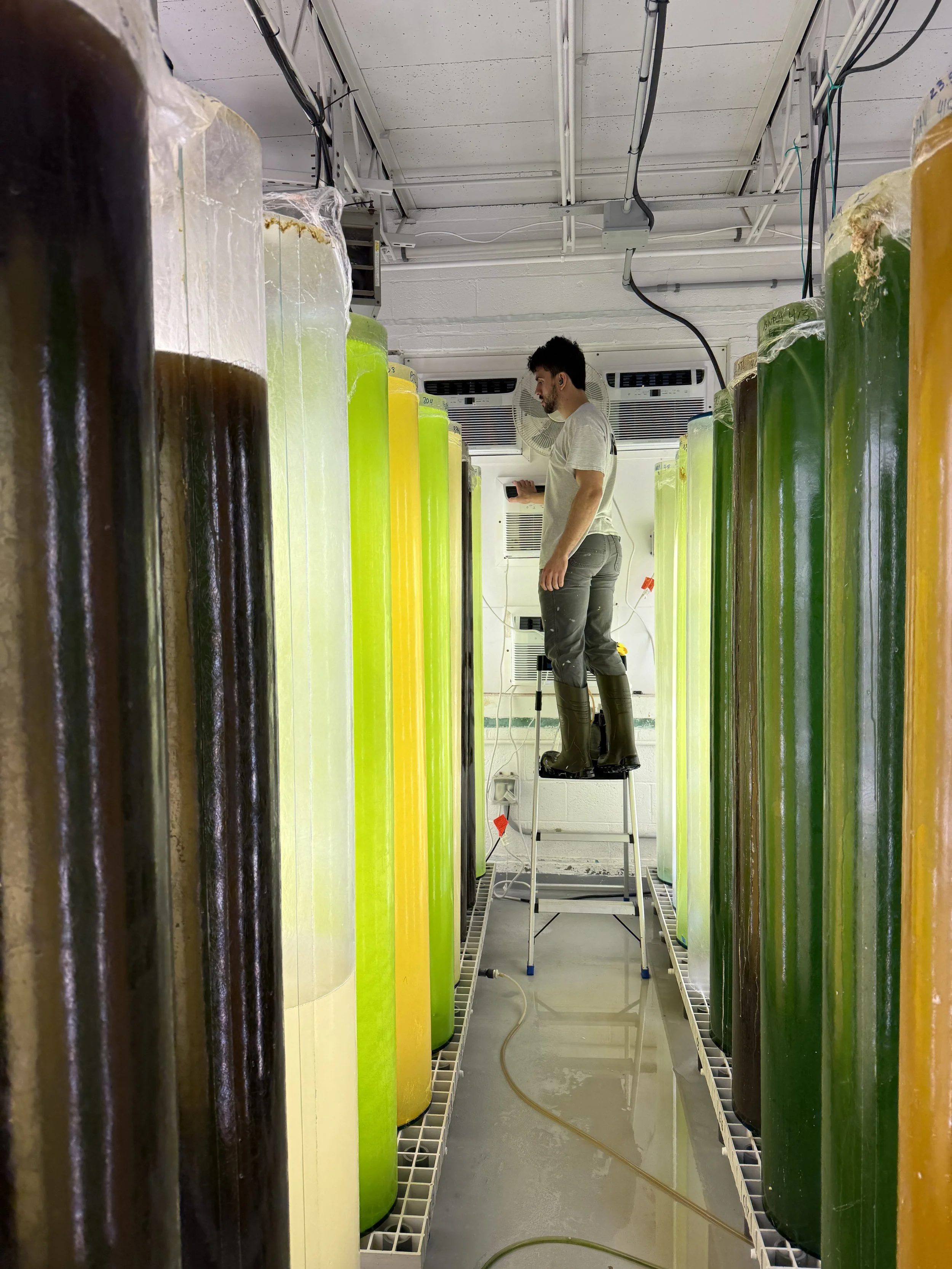 Our team cultivates multiple strains of algae to nourish the shellfish—a critical component of hatchery operations. The health and growth of the shellfish are entirely dependent on the quality of the algae they consume, making this one of the most essential aspects of our work. We maintain two distinct algae cultivation systems: one dedicated to feeding larvae, and another designed for juvenile shellfish.