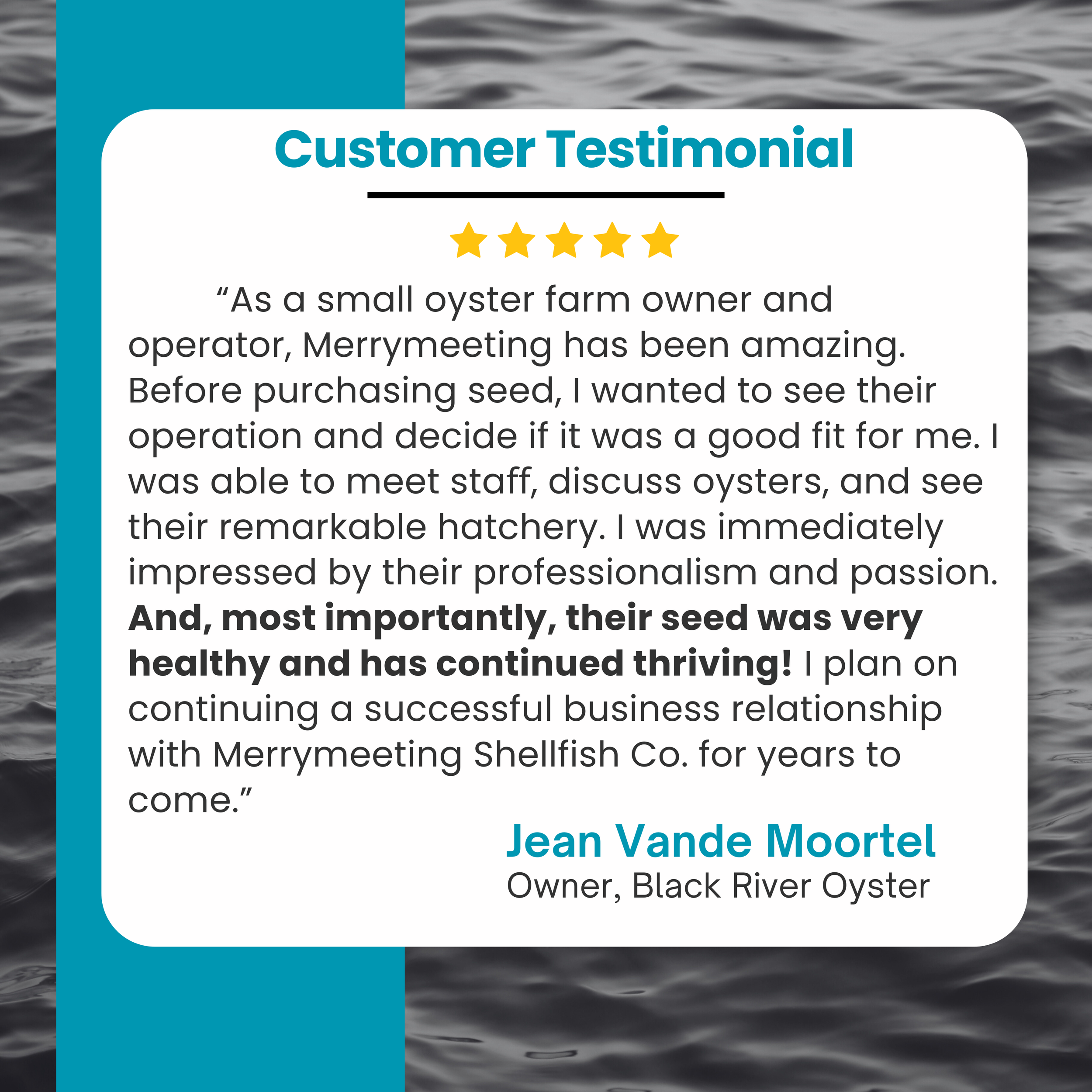 We are a hatchery for growers: Unlike many other hatcheries, we don’t raise oysters to market size or operate our own farm—ensuring that our customers always come first and receive our highest-quality product.